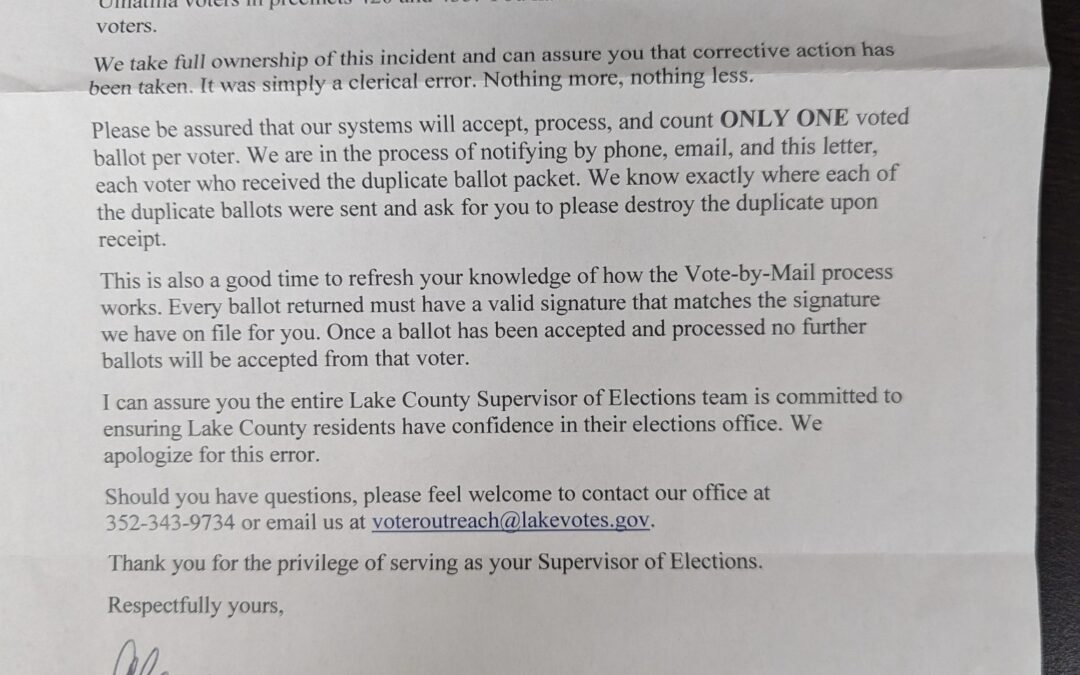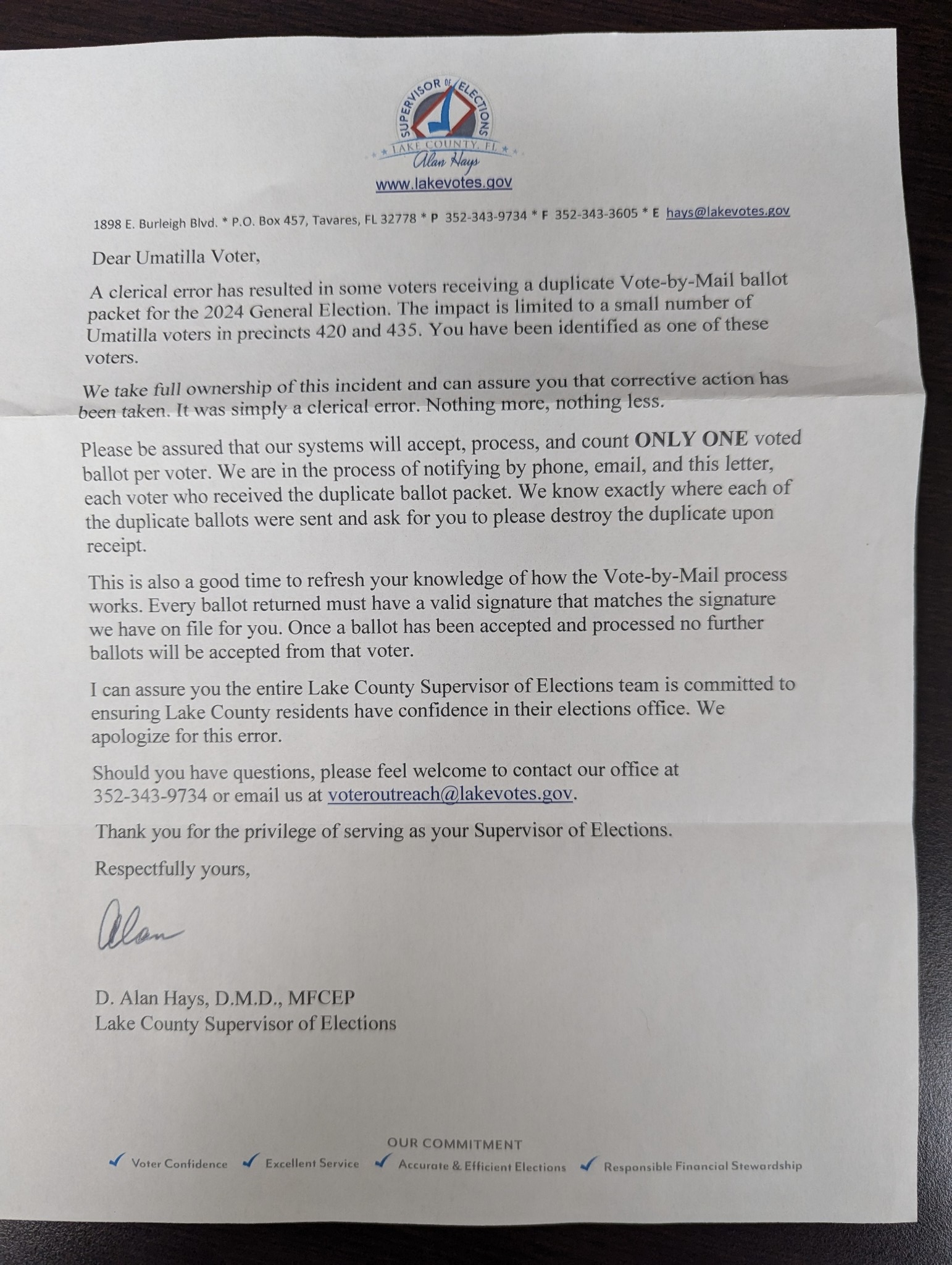 One of the requirements of Florida State Law is that all ballots MUST be accounted for. In response to THIS mistake, Alan Hays has instructed the voters receiving more than one ballot simply to destroy it, never considering that one or more of those ballots MIGHT end up in the hands of a “bad actor.” Never forget that some elections are determined by a handful of votes.